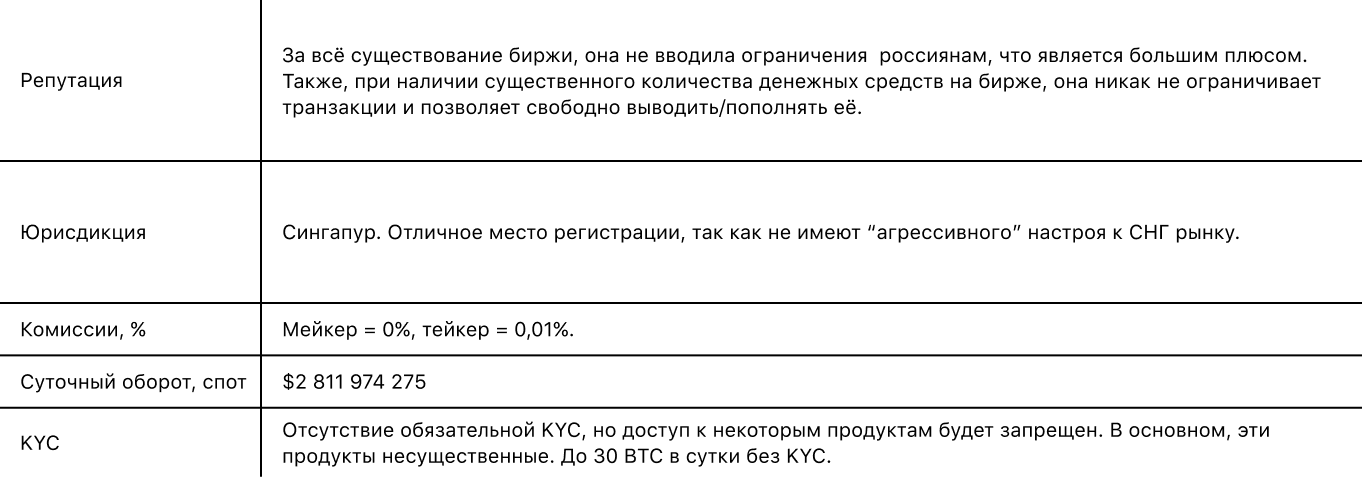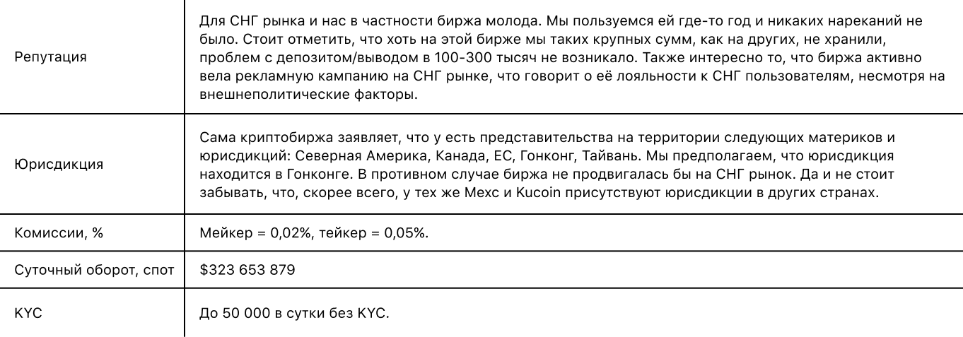 Также хотелось бы отметить, что не стоит регистрироваться на Bybit. Да, они тоже активно продвигаются на СНГ рынок, да и рекламных кампаний у них было много, но частые сообщения от разных пользователей о блокировке их активов и “конские” комиссии полностью перекрывают эти небольшие плюсы.