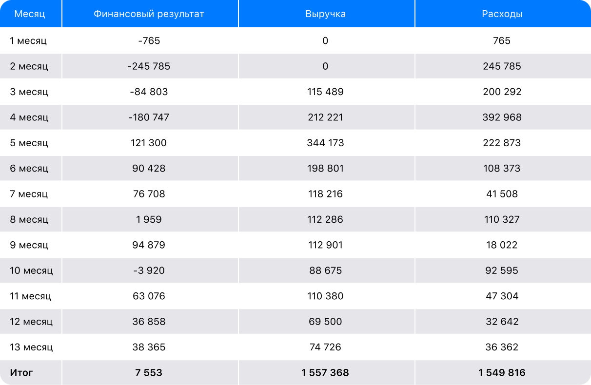 - Планируемая окупаемость проекта составила 17 месяцев. Необходимые расходы составляли 10 тысяч рублей в месяц на менеджера проекта (отвечает за вводные, рекламные места, продажу и привлечение трафика) и 3 тысячи рублей в месяц на редактора.